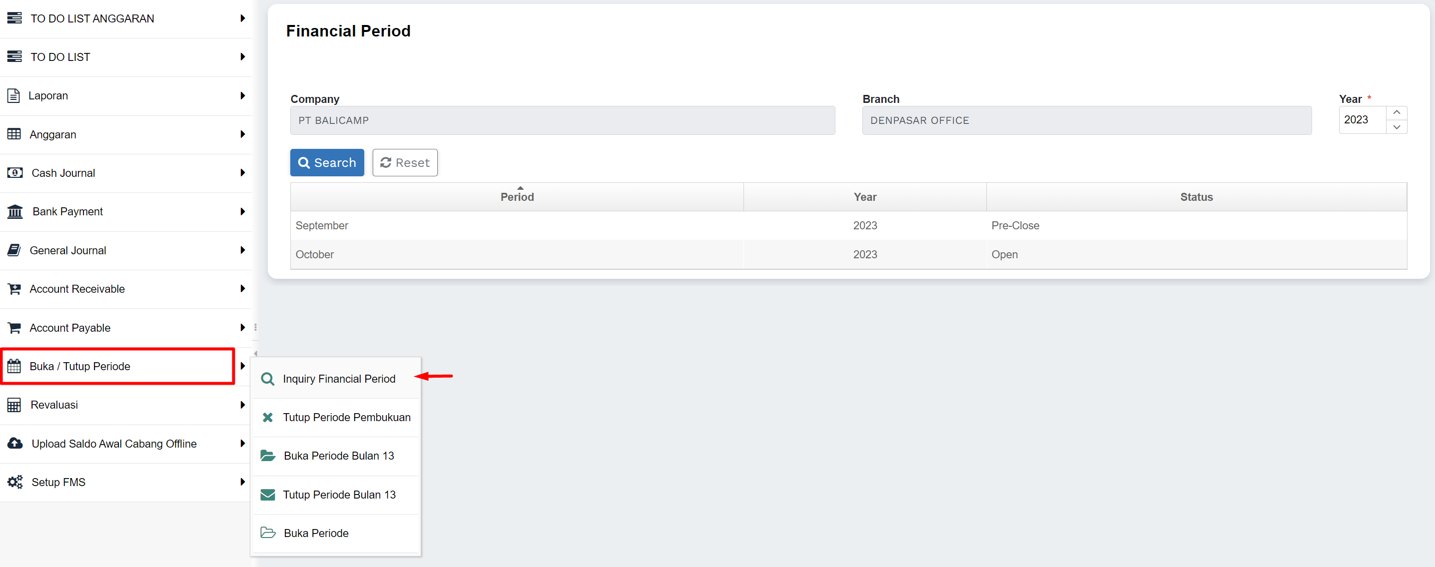 2) Masuk ke menu Buka Tutup Periode » Inquiry Financial Period