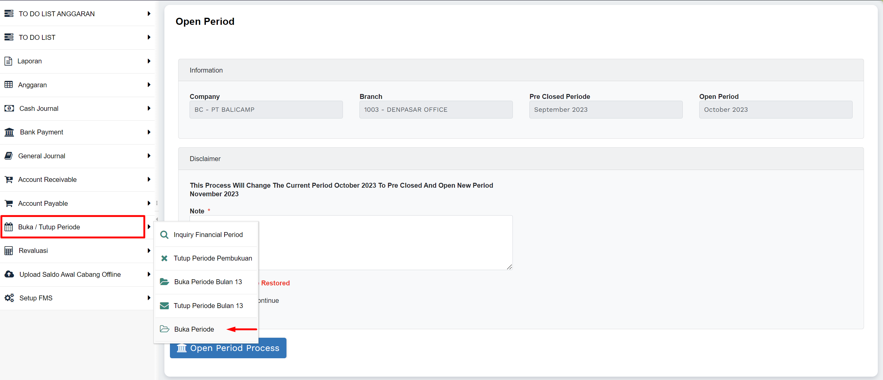 1) Masuk ke menu Buka/Tutup Periode >> Buka Periode