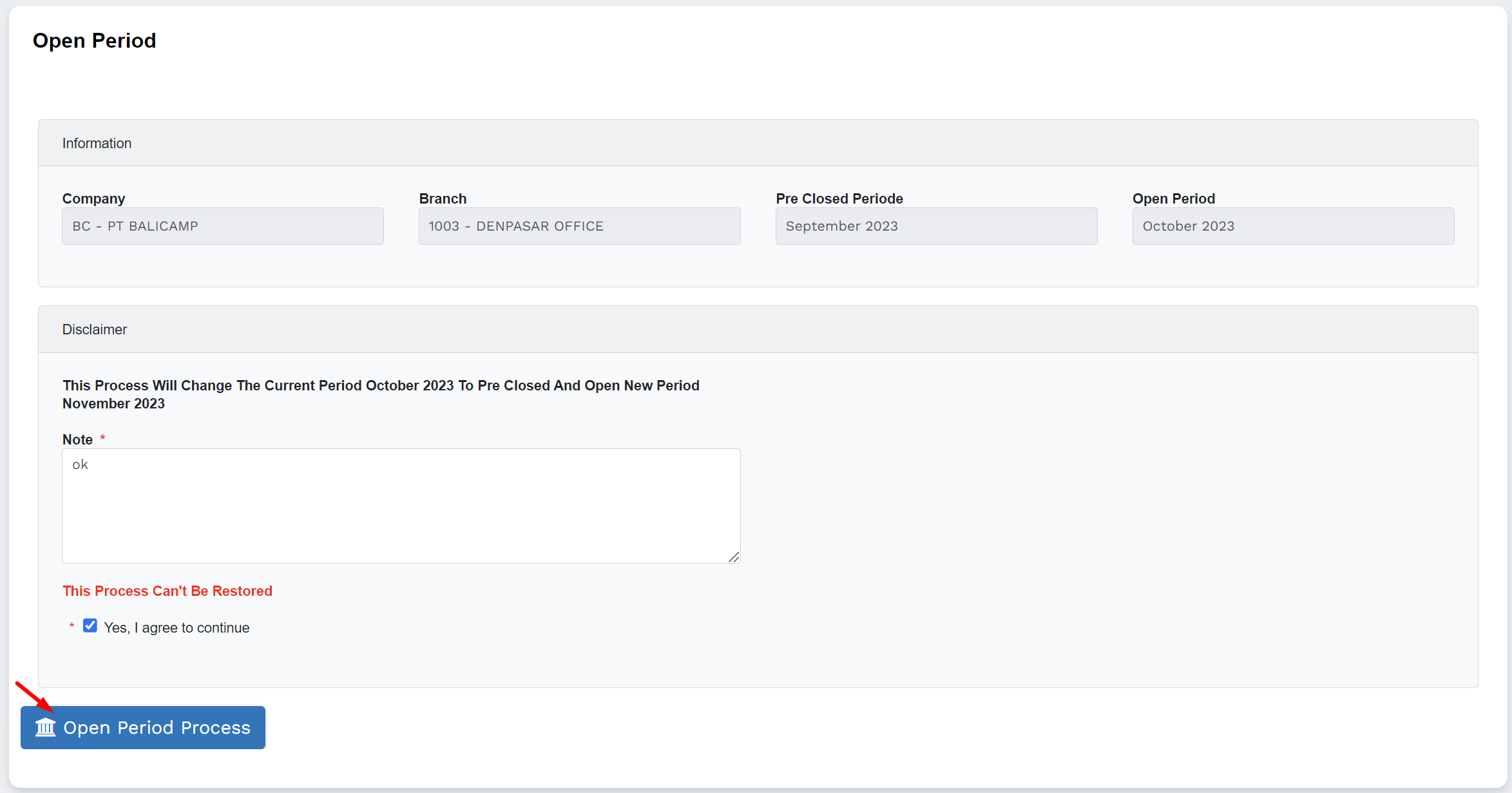 2) Pada halaman Buka Periode Baru, klik tombol Proses Buka Periode