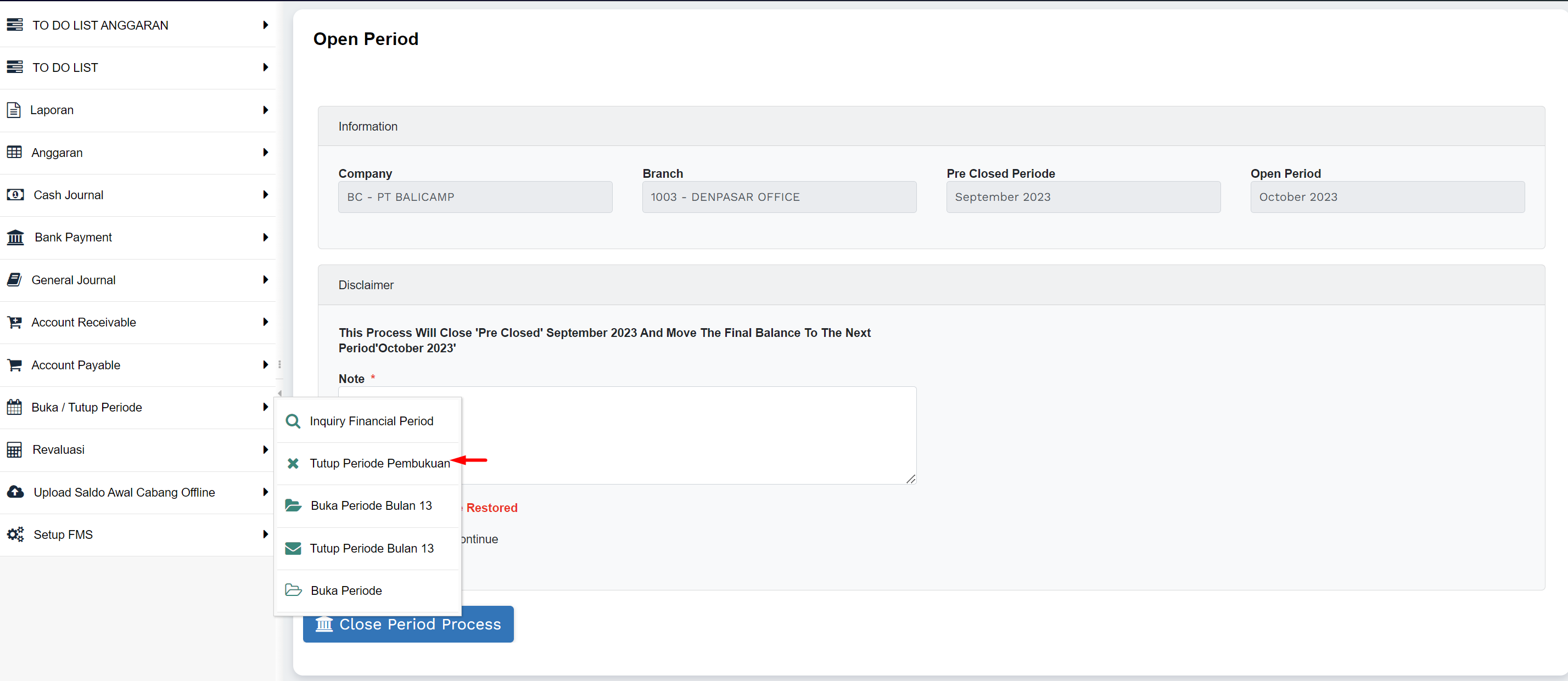1) Masuk ke menu Buka/Tutup Periode >> Tutup Periode
