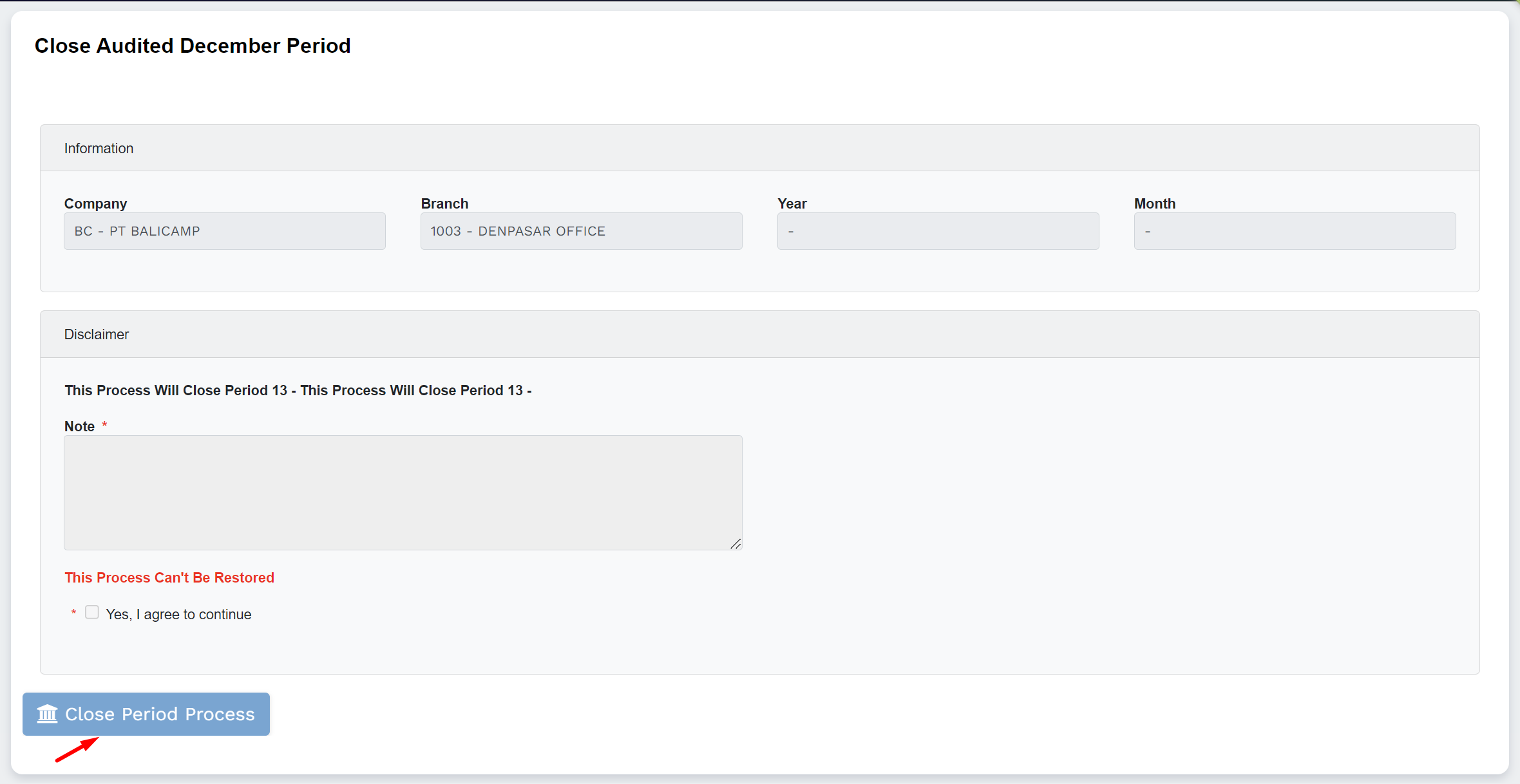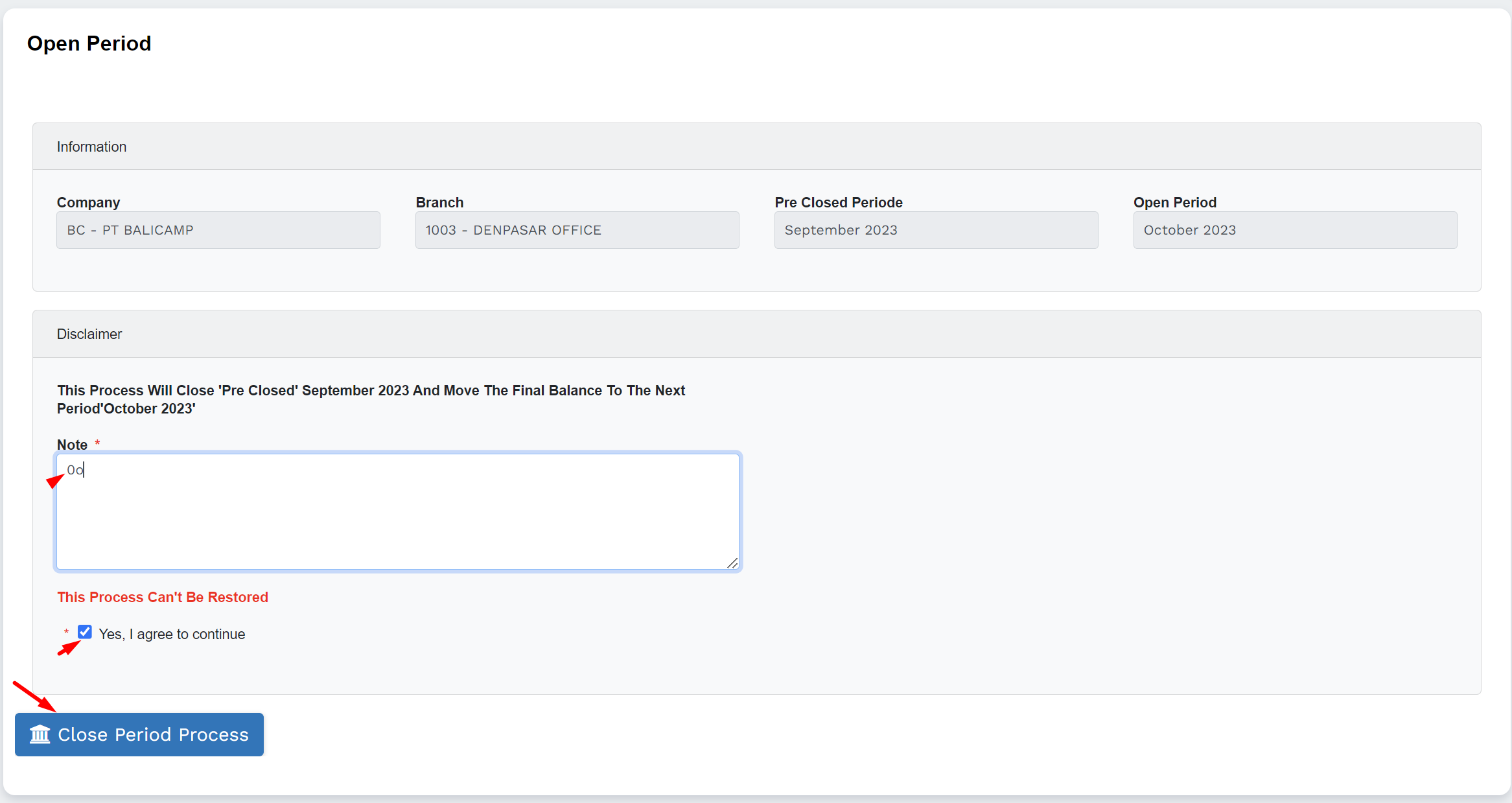 2) Pada halaman Buka Periode Baru, klik tombol Proses Tutup Periode