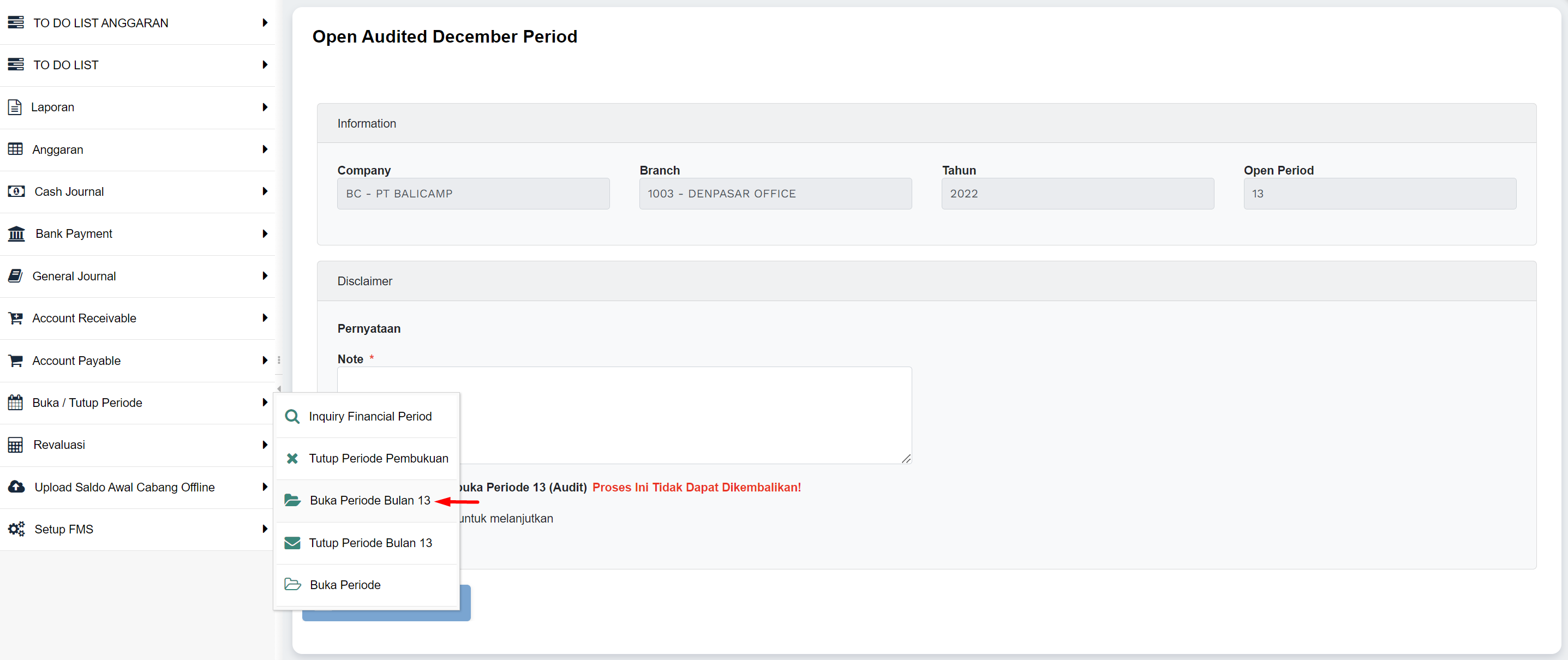 1) Masuk ke menu Buka/Tutup Periode >> Buka Periode 13