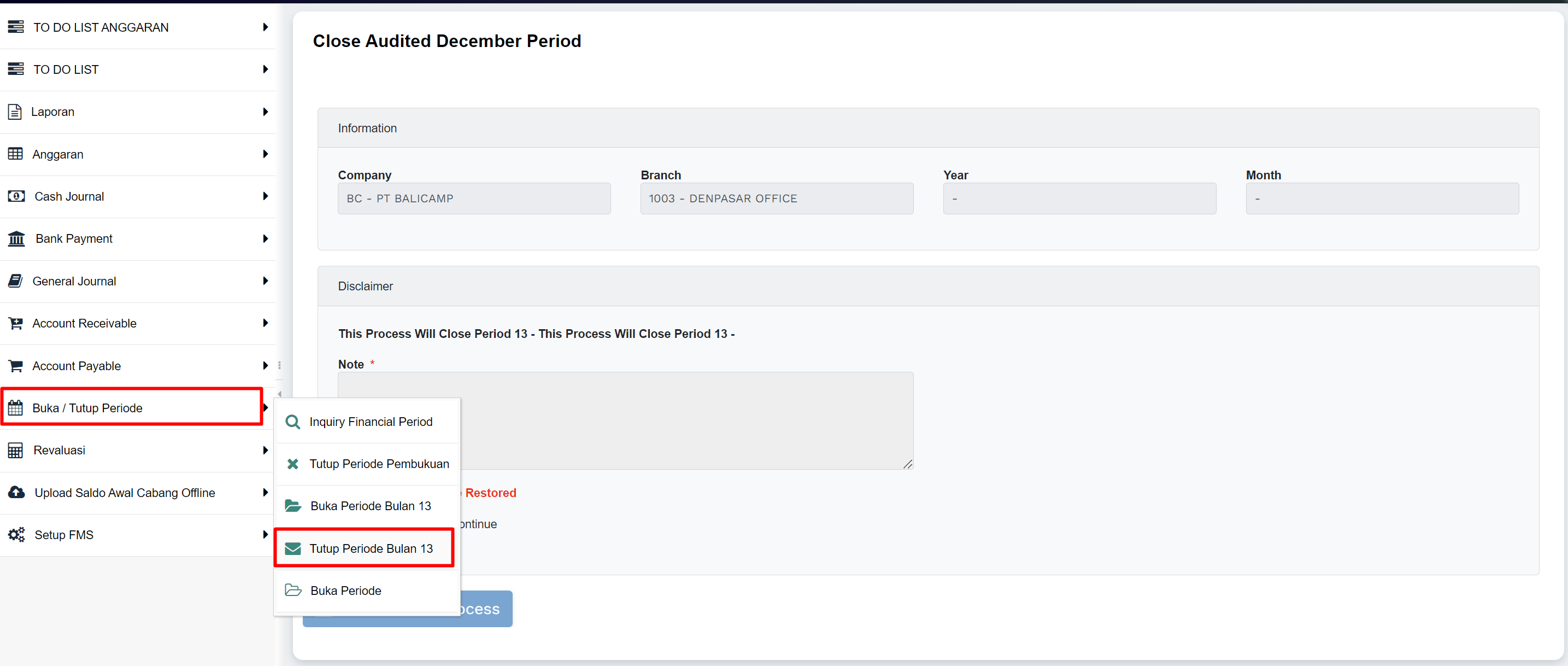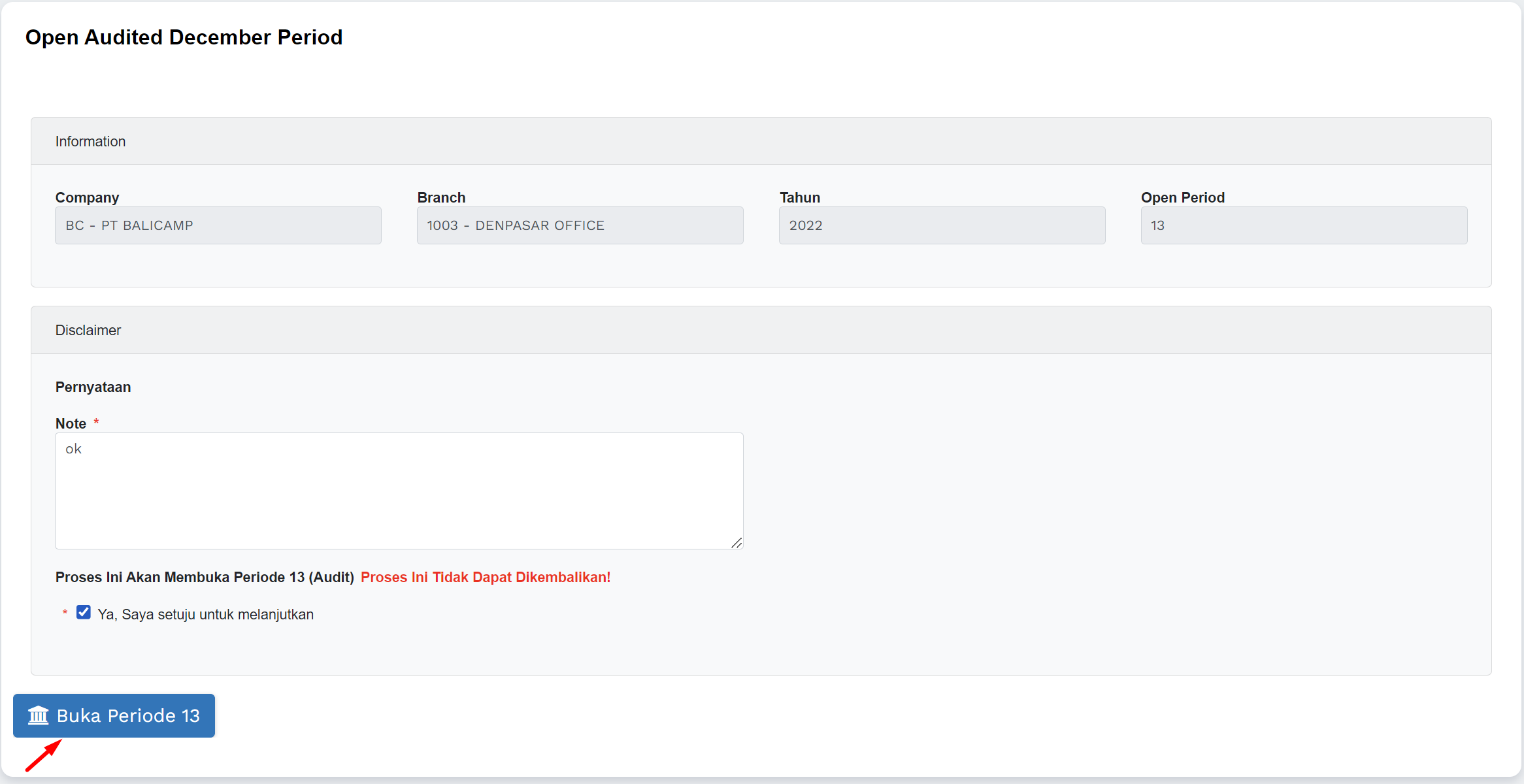 2) Pada halaman Buka Periode Baru, klik tombol Proses Buka Periode 13