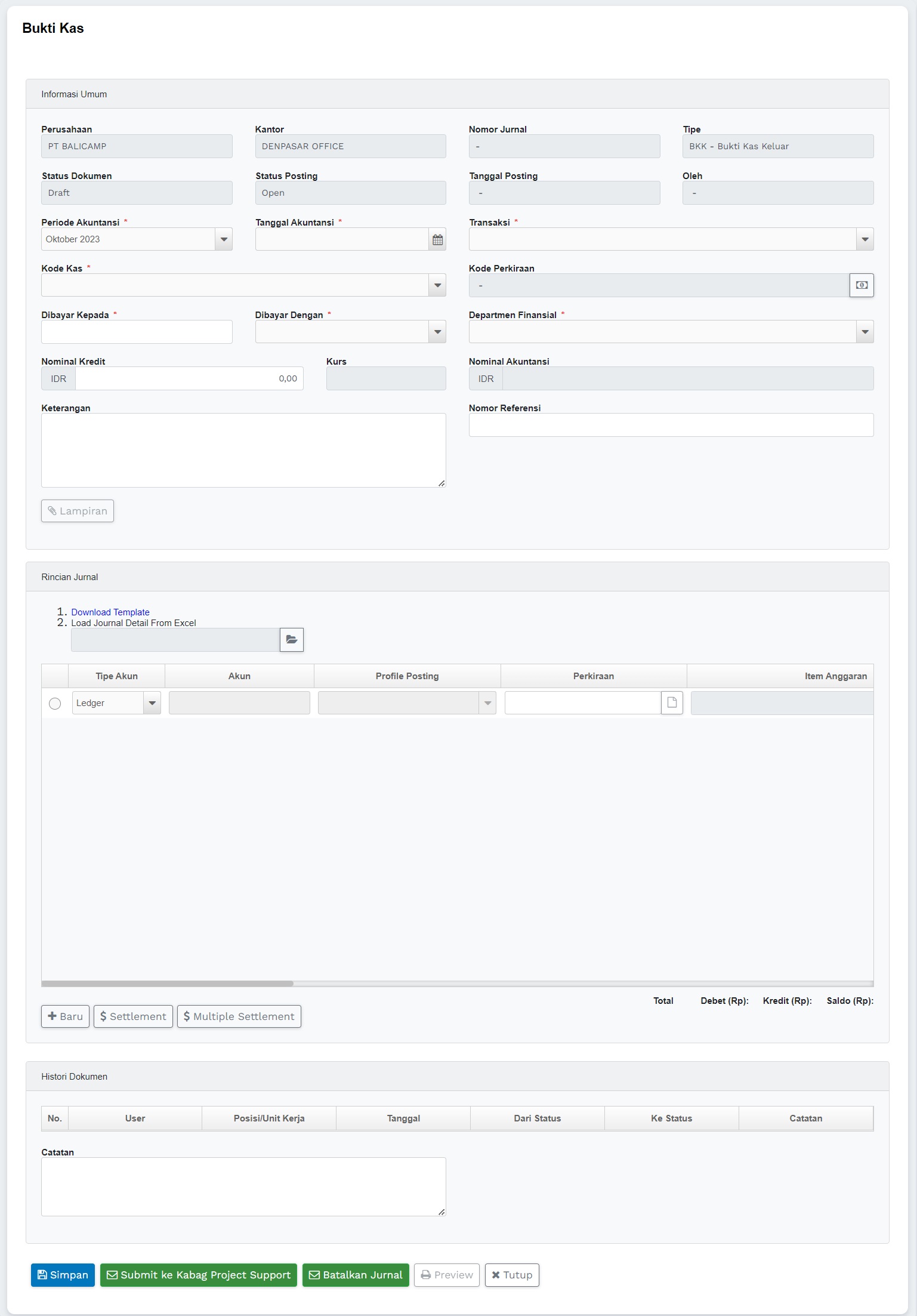 - Periode Akuntansi = otomatis sesuai periode akuntansi aktif (open), user dapat memilih ke periode sebelumnya jika belum dilakukan tutup bulan periode tersebut.