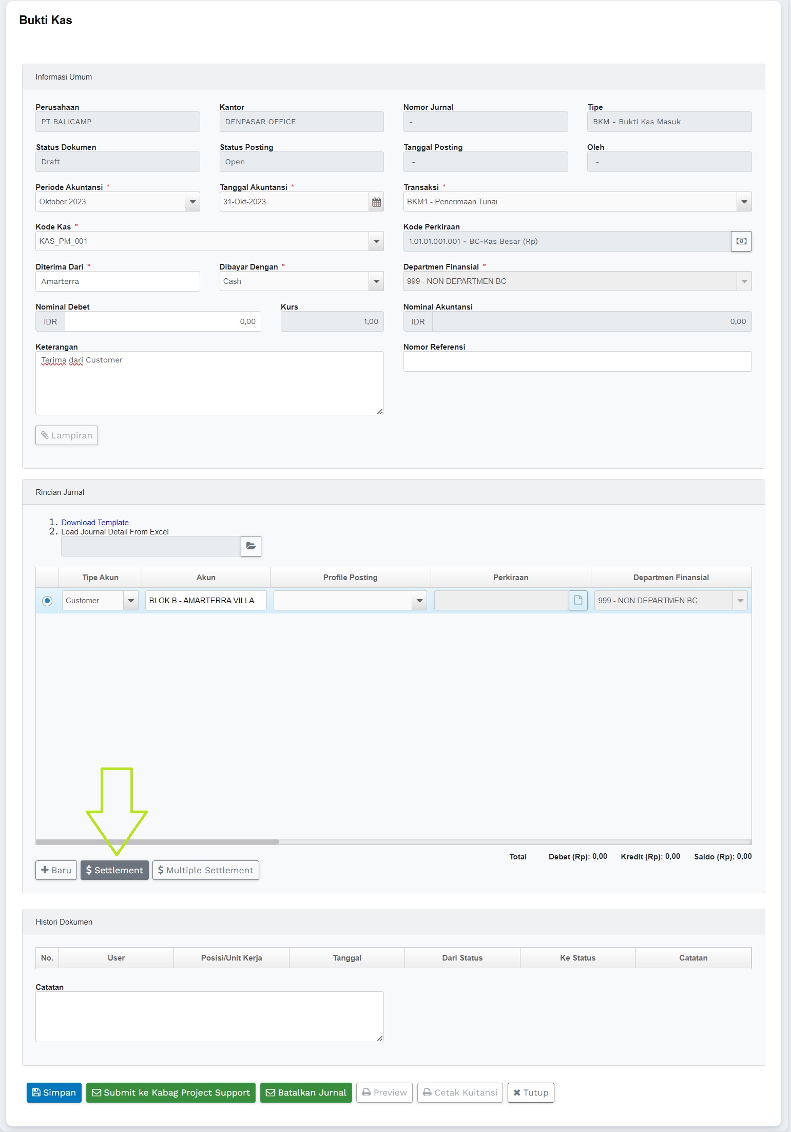 Untuk pelunasan piutang customer pastikan menggunakan fitur SETTLEMENT dengan mengklik record dg account type = Customer, pilih nama Customer dan Nama Account dan klik tombol SETTLEMENT untuk menampilkan oustanding piutang customer tersebut dengan ilustrasi sbb: