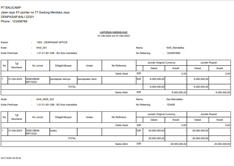 - Pilih Laporan > Keuangan > Buku Kas / Harian Kas