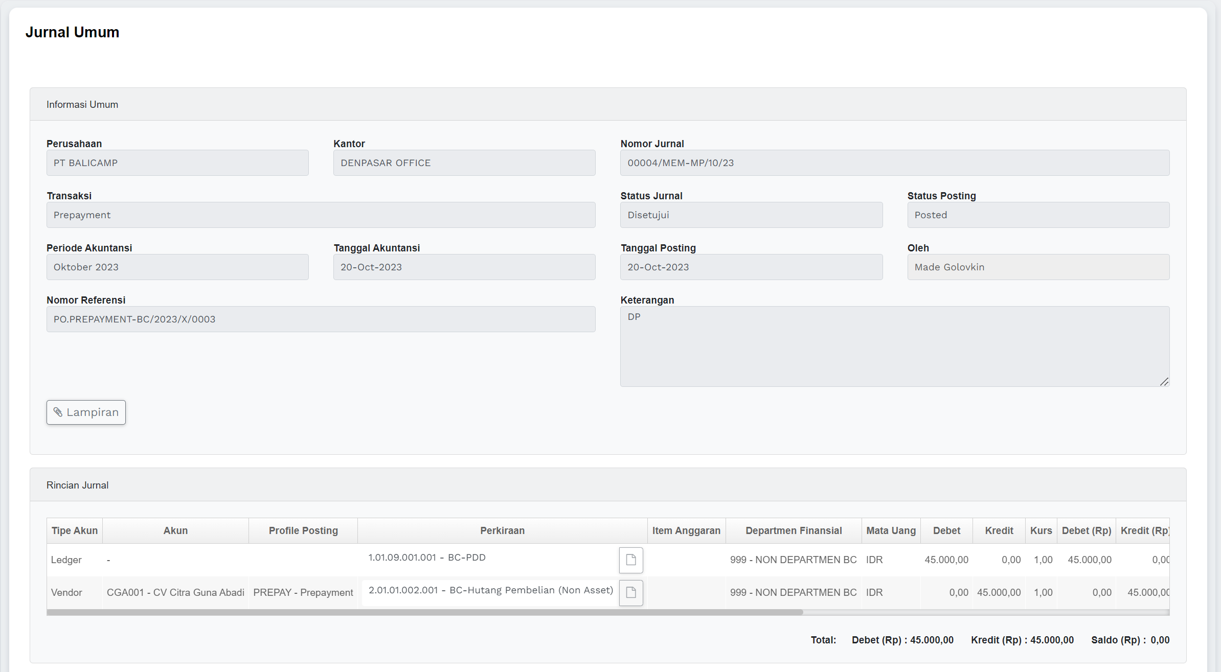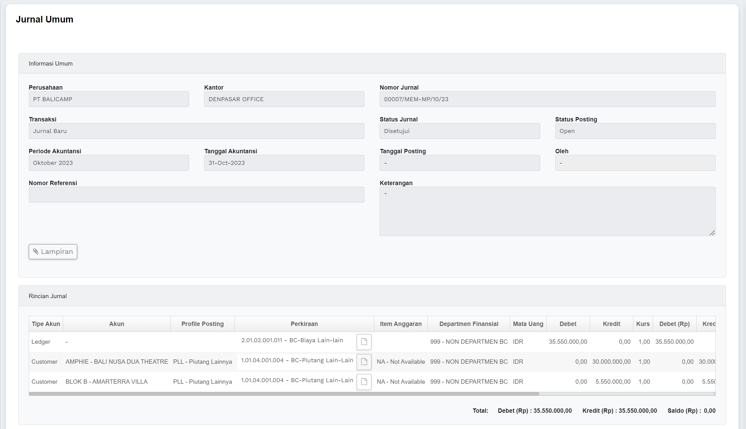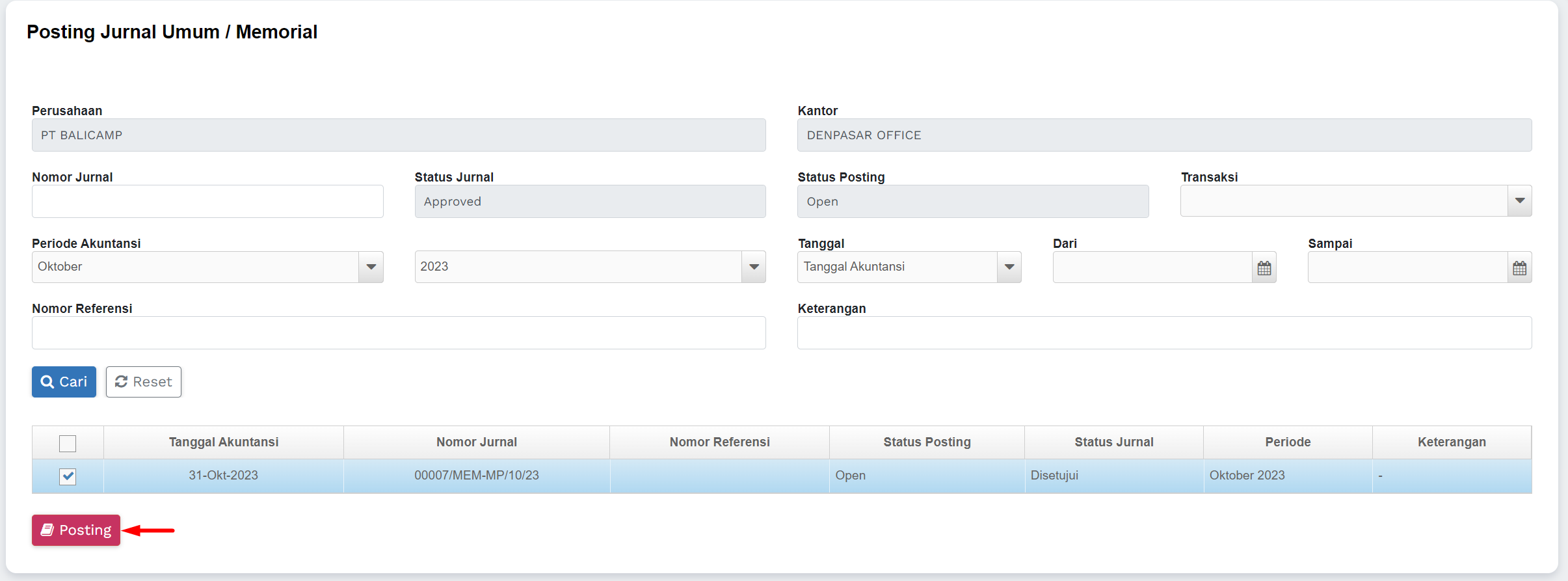 | Status Posting | 1. Belum Diposting (Open): Transaksi atau jurnal yang telah dimasukkan ke dalam sistem akuntansi tetapi belum diposting atau belum tercatat dalam buku besar. Ini berarti pengaruh transaksi belum tercermin dalam akun-akun keuangan. 2. Sudah Diposting (Posted): Transaksi atau jurnal yang telah diposting atau tercatat dalam buku besar dan telah mempengaruhi saldo akun-akun yang sesuai. Ini berarti bahwa transaksi tersebut sudah menjadi bagian dari catatan keuangan perusahaan. |