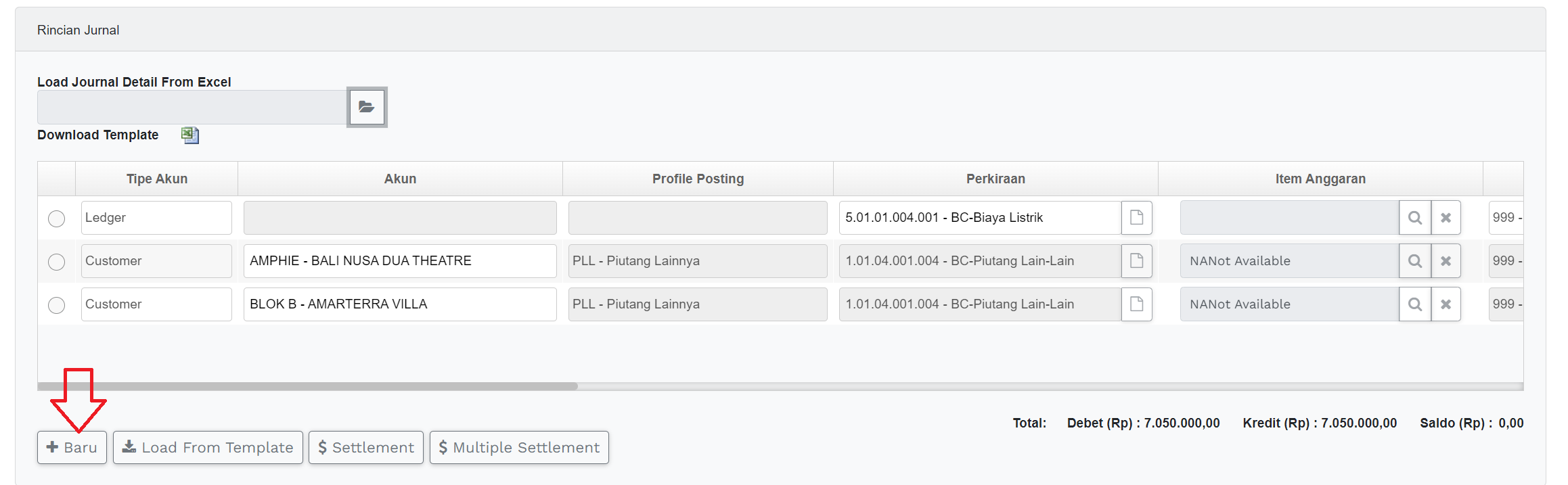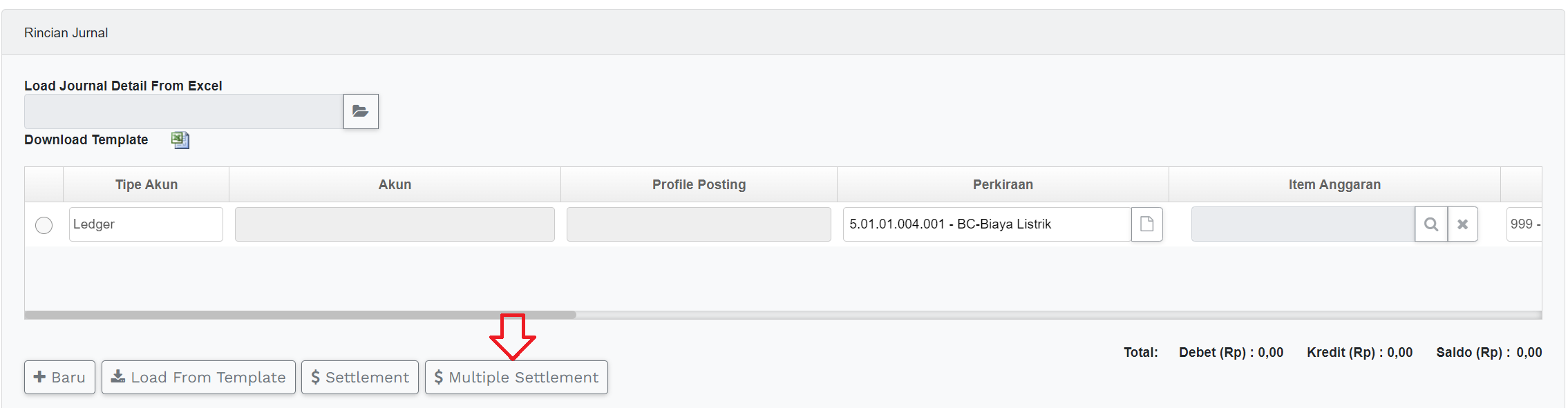 1) Pada halaman Main Account Editor klik tombol “Multiple Settlement”