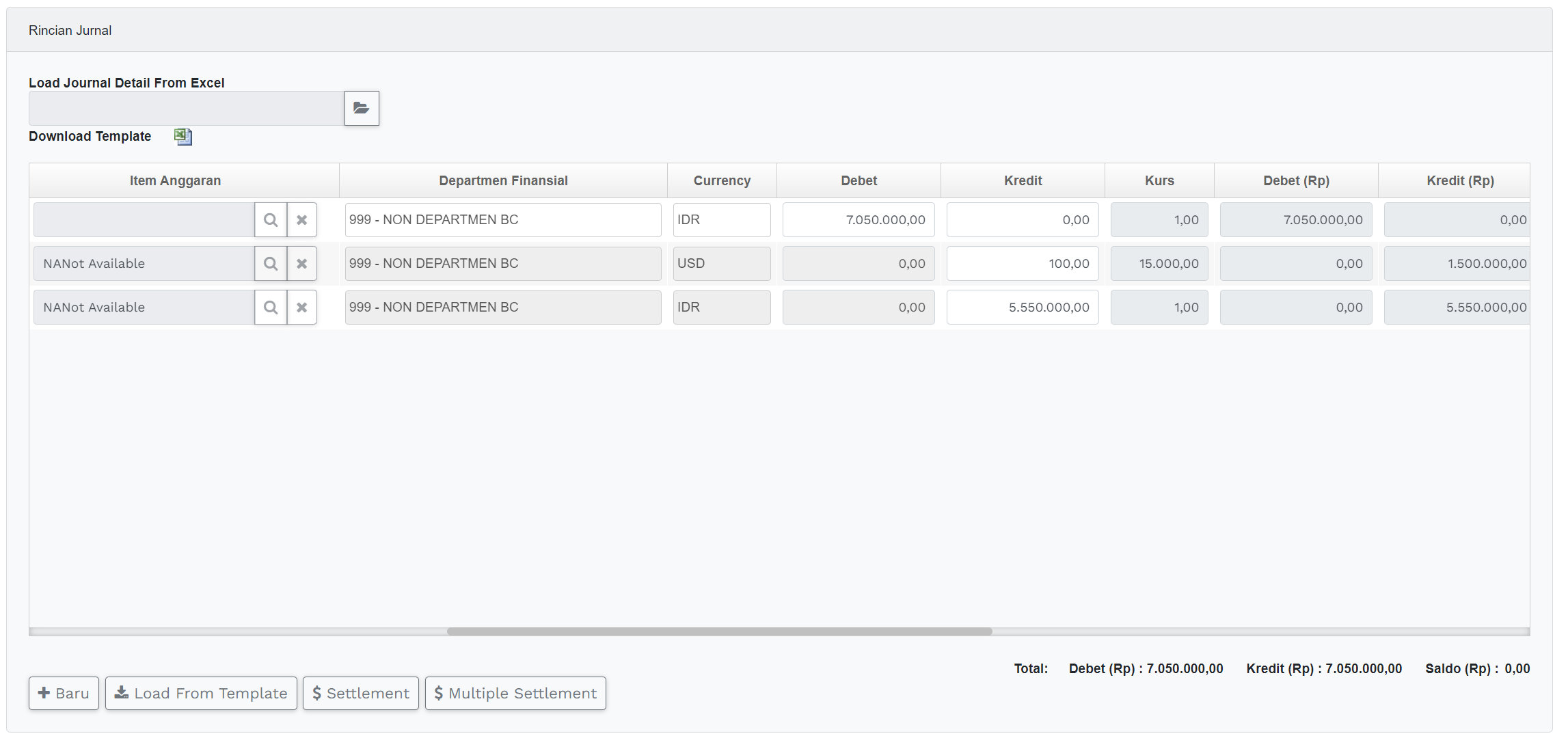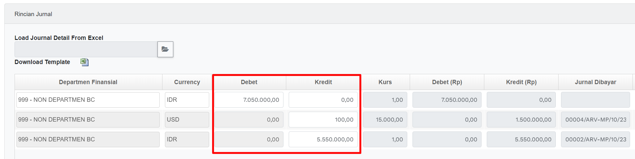 | Debet (Rp) / Kredit (Rp) | Field yang menampilkan nilai akuntansi dalam rupiah yg terhitung secara otomatis oleh system dimana nilai ini dihasilkan dari nilai debet/kredit dikalikan dengan nilai Kurs