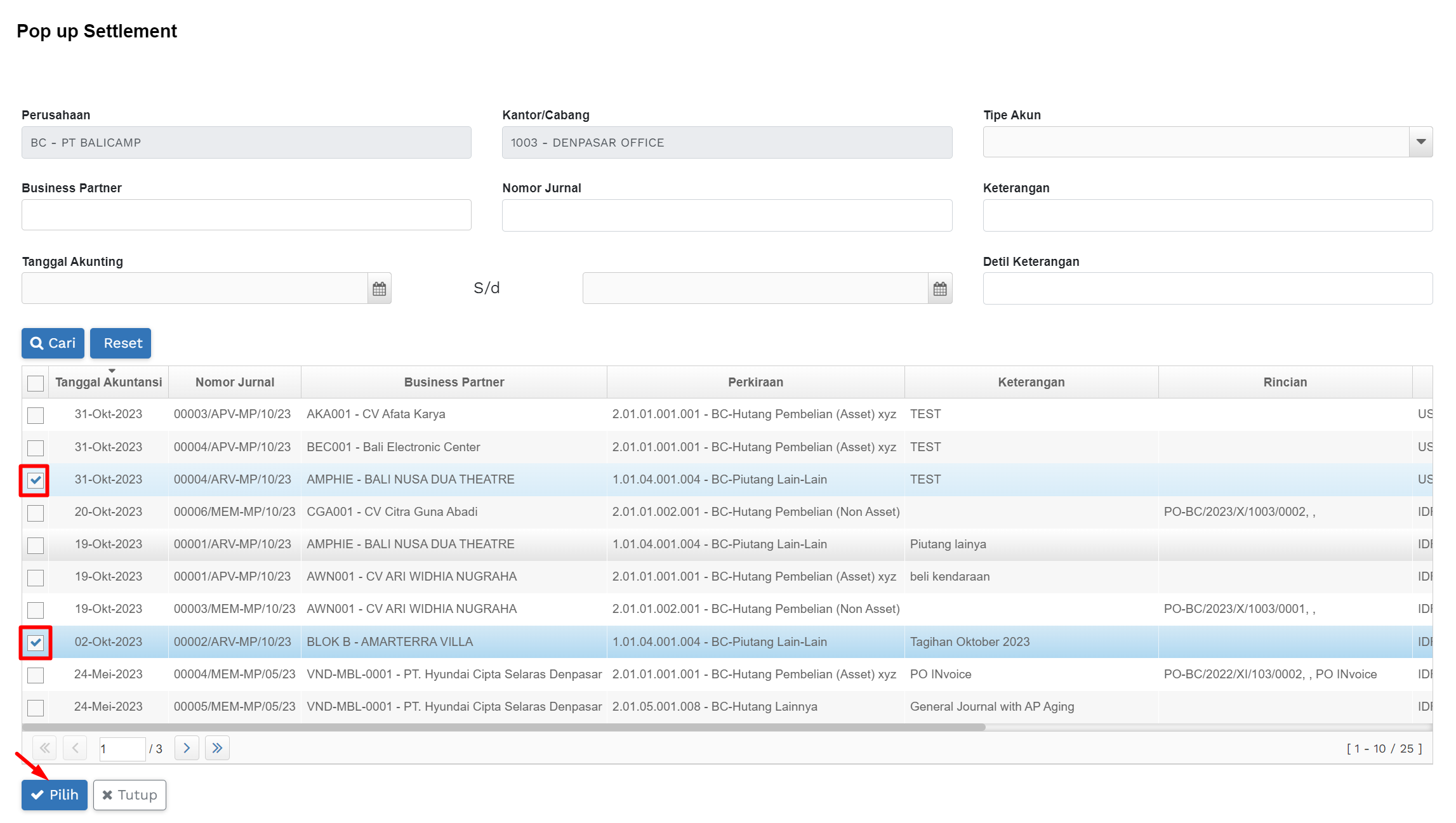 2) Pada popup settlement pilih data, kemudian klik tombol “Pilih”