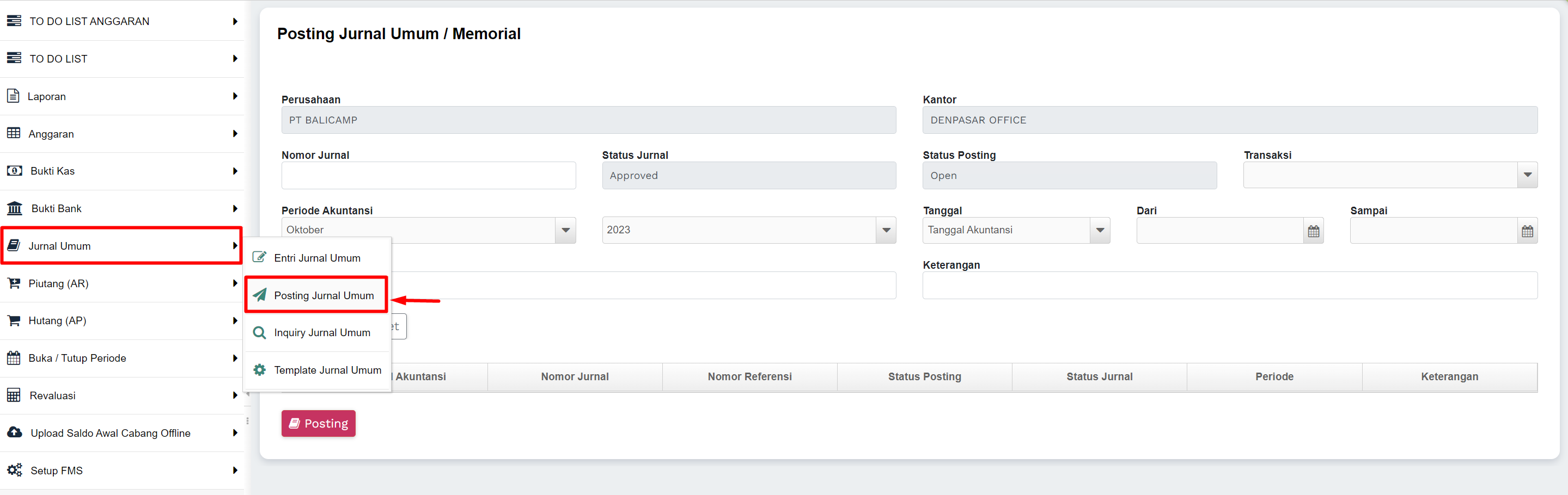 1) Masuk ke menu Jurnal Umum >> Posting Jurnal Umum