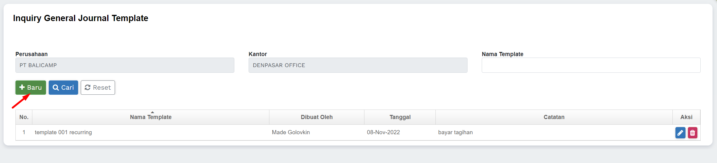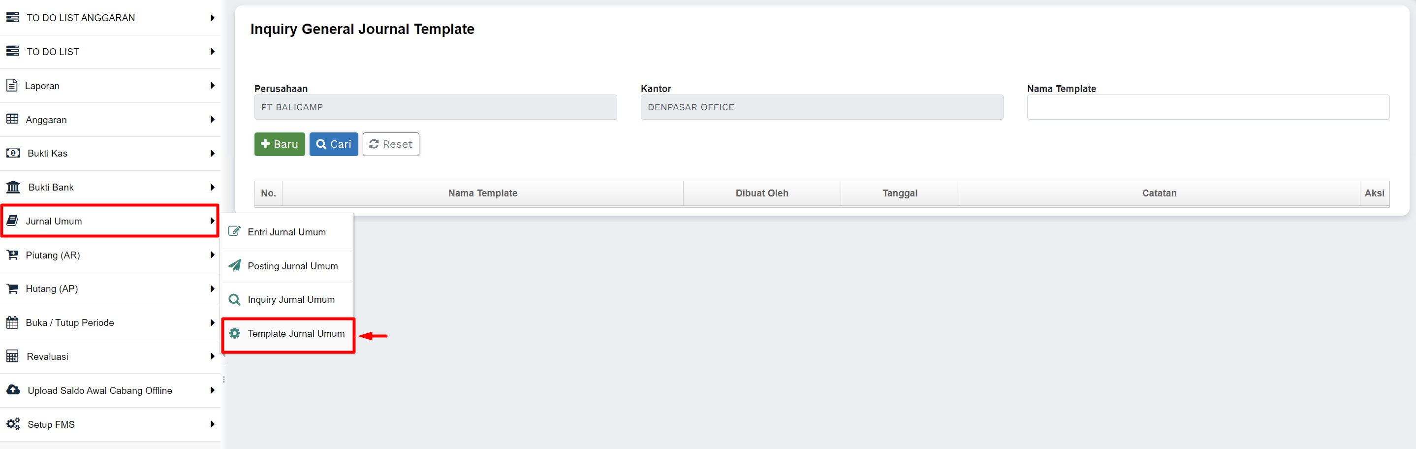 1) Masuk ke menu Jurnal Umum >> Template Jurnal Umum
