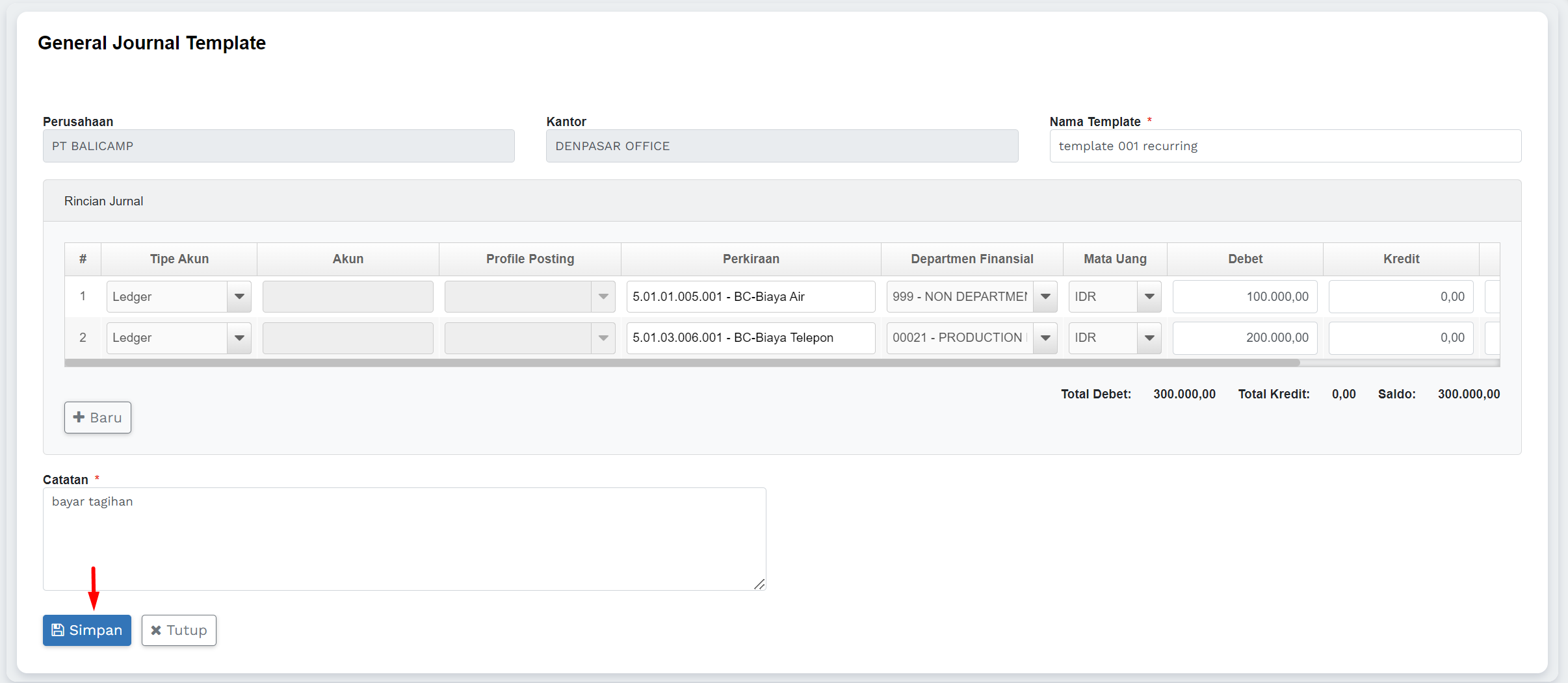 3) Pada halaman editor template jurnal umum, isi field yang diperlukan kemudian klik tombol simpan