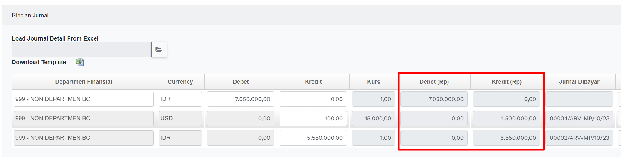 | Debet (Rp) / Kredit (Rp) | Field yang menampilkan nilai akuntansi dalam rupiah yg terhitung secara otomatis oleh system dimana nilai ini dihasilkan dari nilai debet/kredit dikalikan dengan nilai Kurs