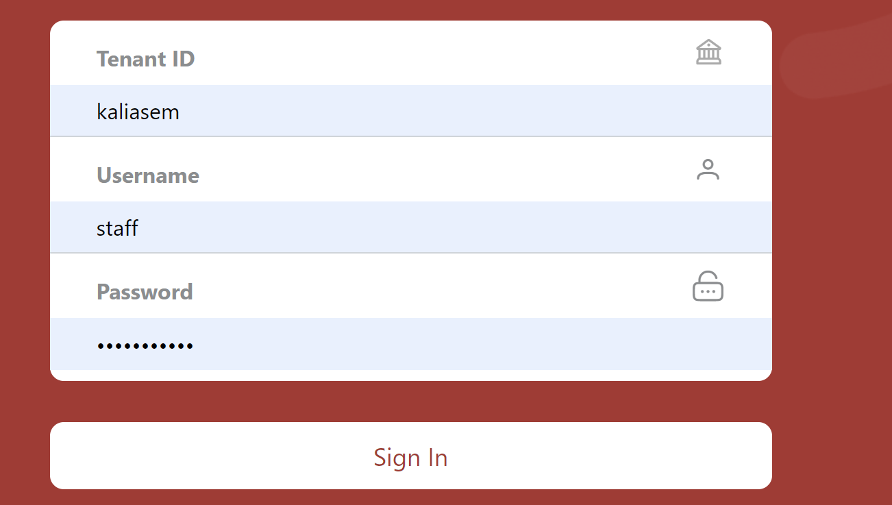 - Masukkan Tenant ID, nama pengguna (username) dan kata sandi (password) yang telah Anda daftarkan saat mendaftar.